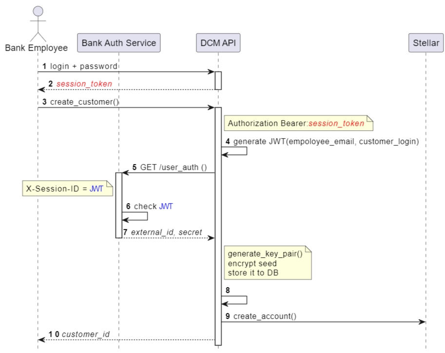 На кроці 2 Банк генерує JWT, який використовується на кроці 5 у заголовку CX-Authorization, коли працівник Банку виконує операцію (наприклад, створює нового клієнта). На кроці 6 DCM перевіряє JWT. Те саме робить Банк на кроці 8.