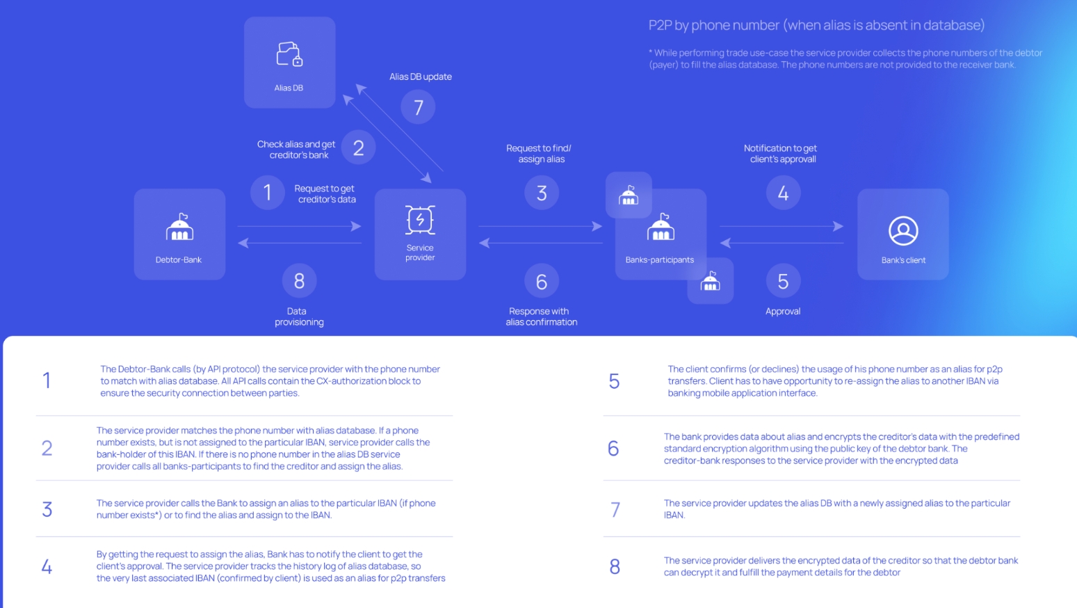 The DCM platform offers participating banks a P2P transfer mechanism for transactions between individuals (bank clients) under the following scenarios: