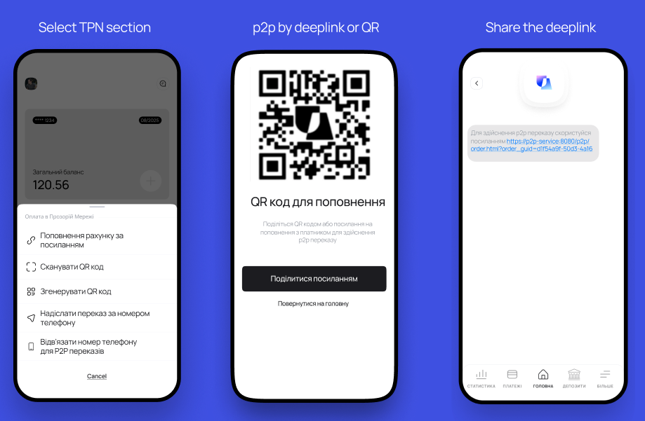 Unlike alias-based payments, P2P via link is initiated by a client who wishes to receive funds into their account using a QR code or deeplink.